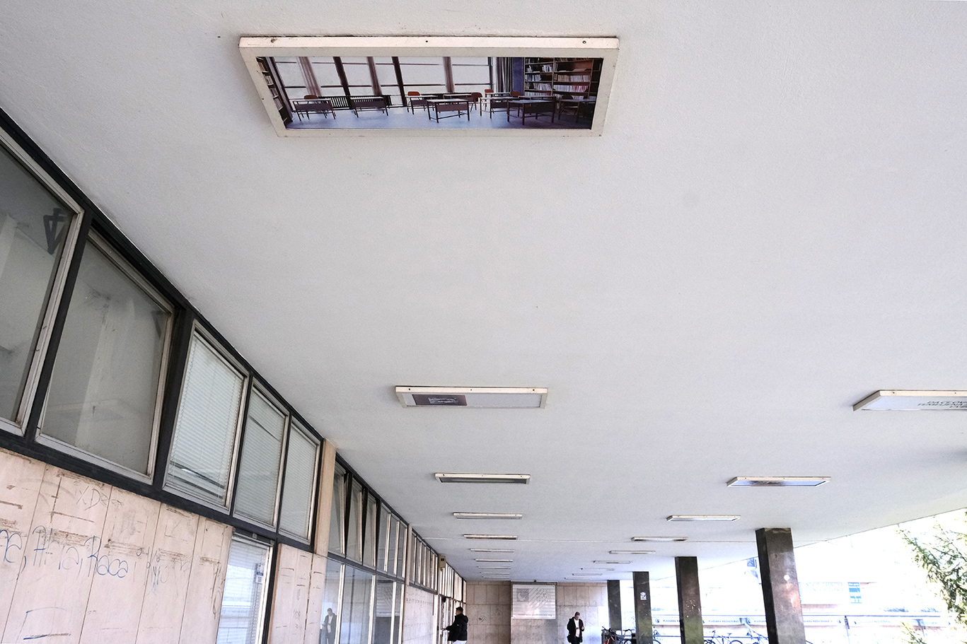 Prijedlog umjetničke intervencije u kultnom zdanju Pučkog otvorenog učilišta u Zagrebu, izgrađenom prema projektu arhitekata Radovana Nikšića i Ninoslava Kučana s ikoničkim interijerom i namještajem Bernarda Bernardija, gradila sam na idealiziranoj predodžbi temeljenoj na "udžbeničkom" predznanju i statusu spomenika kulture. Za razliku od nekih drugih objekata u fokusu mojih umjetničkih interesa, zgrada nije napuštena, pa me iznenadilo što održanje izvorne namjene ne isključuje prepuštenost propadanju. Ambijent zamišljen da potencira procese učenja, samoostvarenja, izgradnje zajednice i vizija budućnosti, lišen spomeničkog tretmana primoran je na gotovo stihijsku prilagodbu "novom dobu".