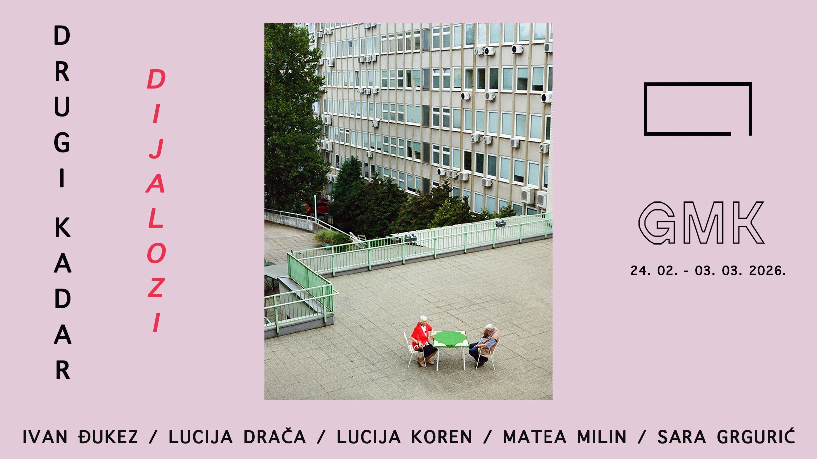 Pozivamo vas da se u utorak, 24. veljače u 19 sati, u Galeriji Miroslav Kraljević (GMK) prizružite otvorenju izložbe Dijalozi polaznika škole umjetničke fotografije Drugi kadar. Izložbom će biti predstavljeni fotografski radovi Ivana Đukeza, Lucije Drače, Lucije Koren, Matee Milin i Sare Grgurić, nastali u sklopu naprednog programa škole u 2025. godini pod mentorstvom Ivana Gundića, Nives Milješić i Nike Petković. Izložbu će biti moguće pogledati do 3. ožujka 2026., a detalje potražite ovdje.