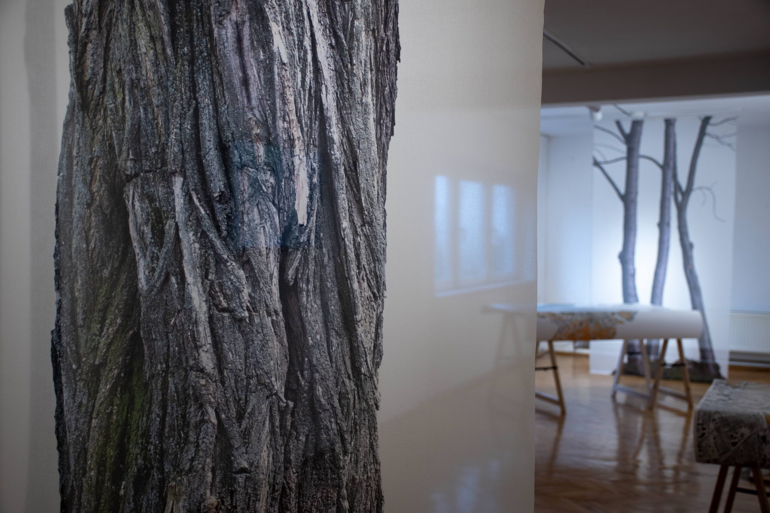 Najmanje diskurzivan dio rada je ‘šuma’ velikih, vertikalnih printeva drveća na bijelom tekstilu. Teško je odoljeti njihovoj aluziji na crni bor oko kojeg je Richter sagradio stražnju sobu. To bizarno drvo i danas, poput Nikinih vertikalnih printeva, stoji okruženo bijelim zidovima kuće. Tako i sami repetitivni printevi, poput spomenutih radnih stolova, djeluju kao lebdeći duhovi prošlosti, materijaliziranje sjećanja i vraćanje nekom neuobičajenom prizoru bora u kući. Ovi osobni dijelovi izložbe, zajedno s diskurzivnim elementima postava, funkcioniraju kao zaokružena cjelina privatnog i društvenog umjetničkog djelovanja s kućom arhitekta kao središtem promišljanja.